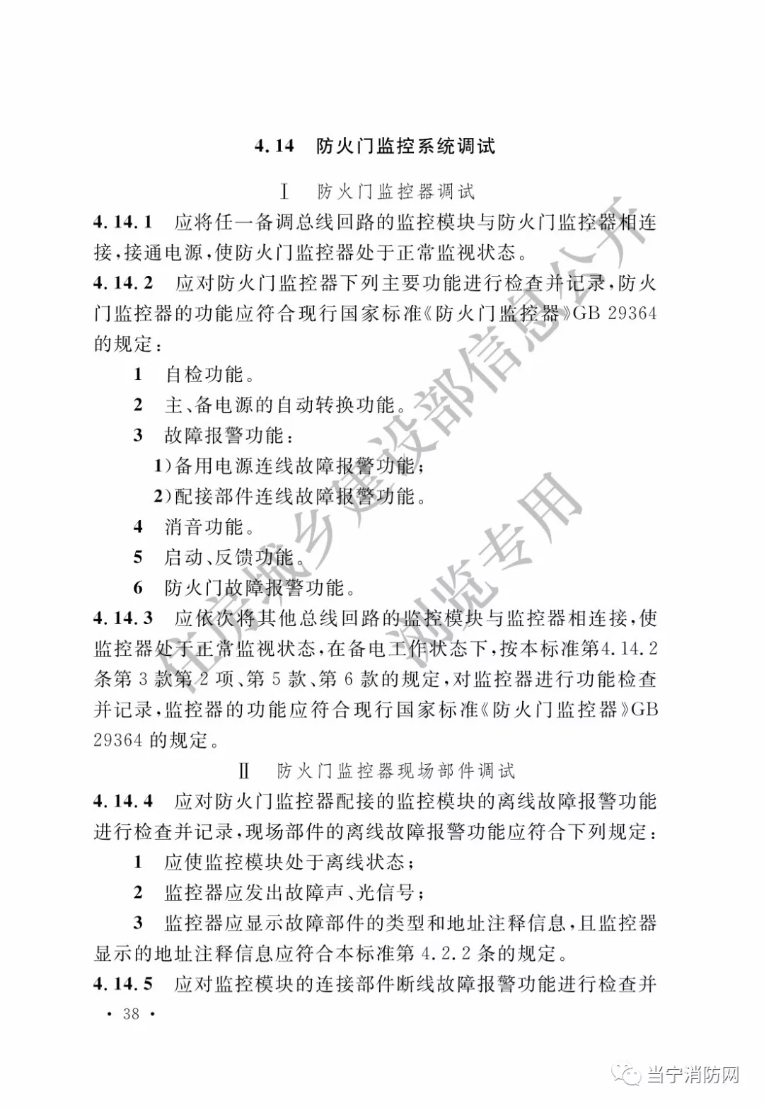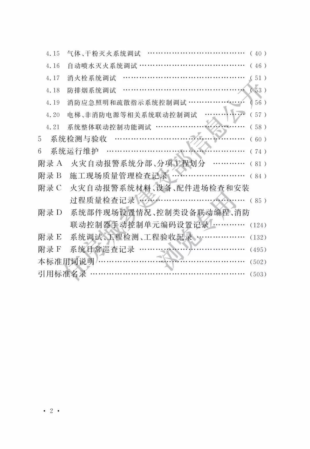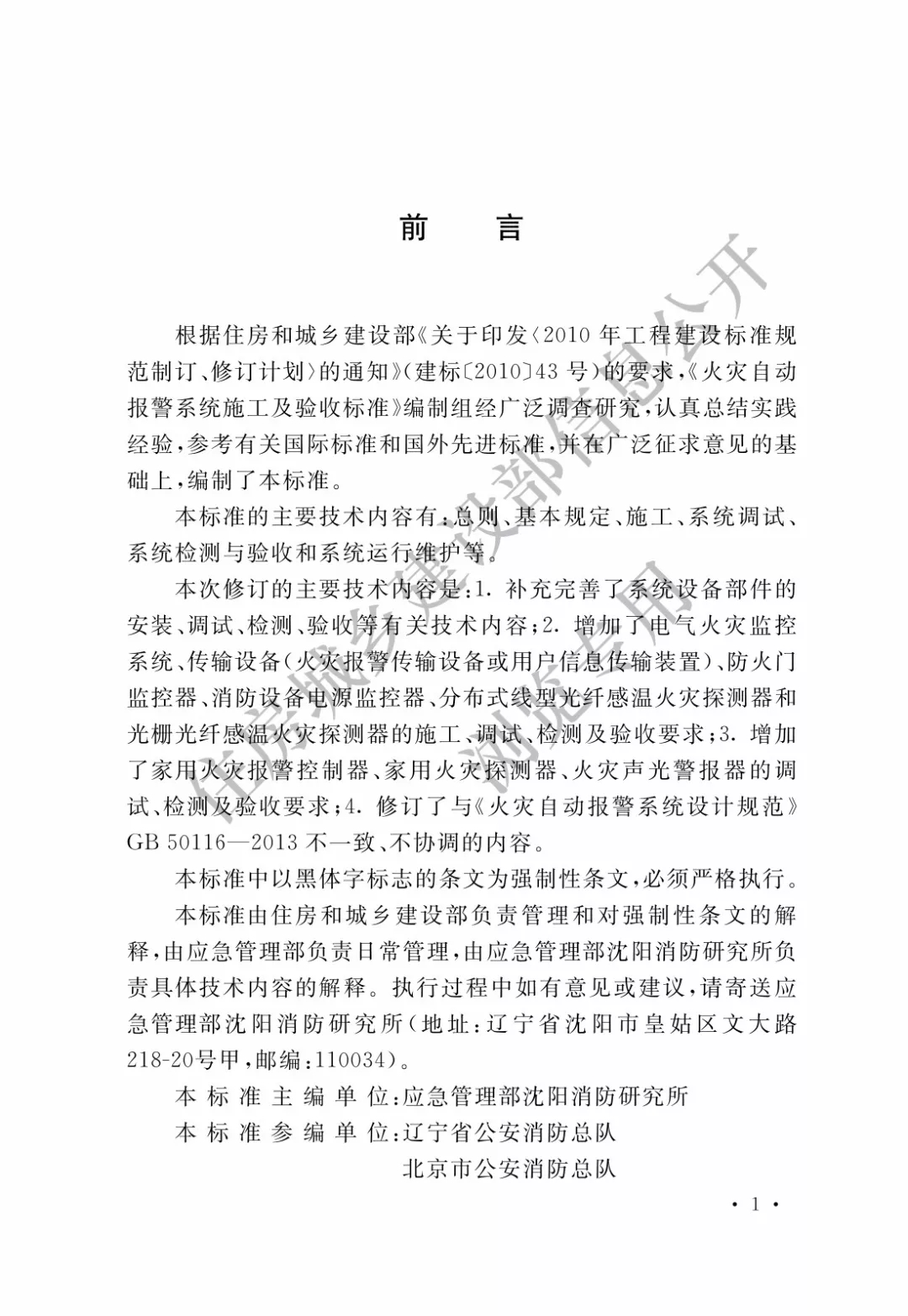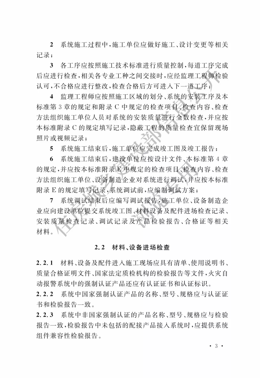 2.增加了电气火灾监控系统、传输设备(火灾报警传输设备或用户信息传输装置)、防火门监控器、消防设备电源监控器、分布式线型光纤感温火灾探测器和光栅光纤感温火灾探测器的施工、调试、检测及验收要求;