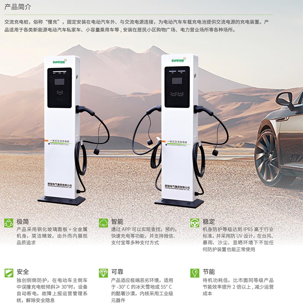 交流充电桩,俗称“慢充”,固定安装在电动汽车外、与交流电源连接,为电动汽车车载充电池提供交流电源的充电装置。产品适用于各类新能源电动汽车私家车、小容量乘用车等,安装在居民小区购物广场、电力营业场所等各种场所。