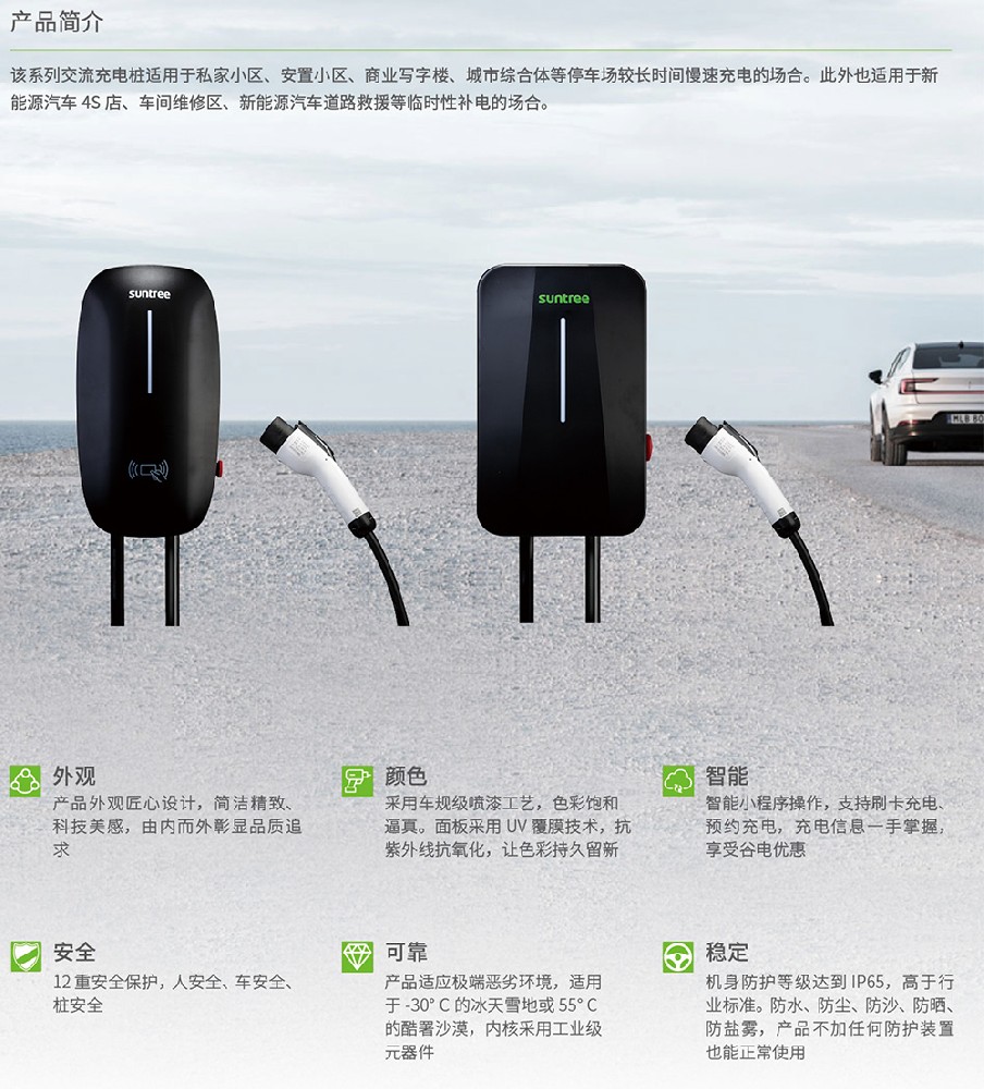 该系列交流充电桩适用于私家小区、安置小区、商业写字楼、城市综合体等停车场较长时间慢速充电的场合。此外也适用于新能源汽车 4S 店、车间维修区、新能源汽车道路救援等临时性补电的场合。