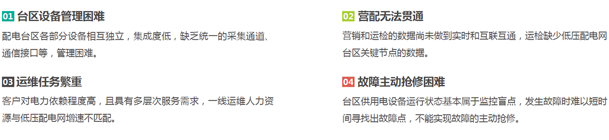 低压配电物联网解决方案,可有力的支撑智能配电网信息化整体架构的自动运行、智能监测、智慧决策,并可重点解决以下几个问题,以提升低压配网 故障综合研判能力,提高故障抢修效率、供电可靠性和客户服务水平。